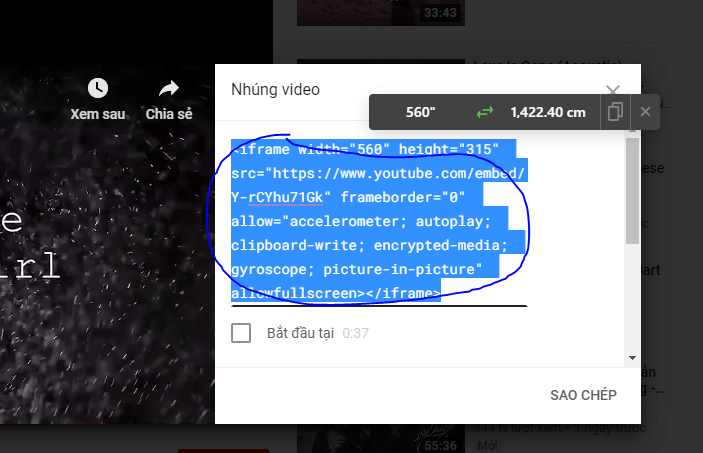 -Click vào nút chia sẻ -> bôi đen và copy mã nhúng.