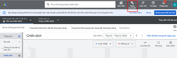 Bước 1: Truy cập vào tài khoản quảng cáo Google ads -> chọn biểu tượng 'Công cụ và cài đặt"