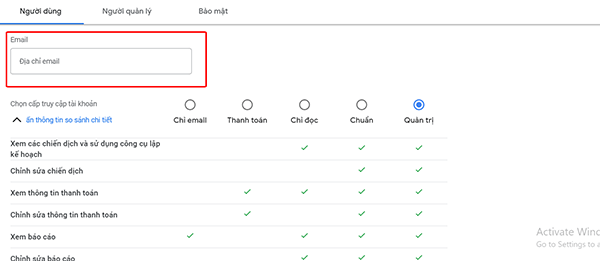 Bước 2: Chọn biểu tượng dấu + và nhập email vào để thêm người dùng vào tài khoản. Lưu ý tích chọn quyền cho tài khoản được phân quyền: email, thanh toán, quản trị...
