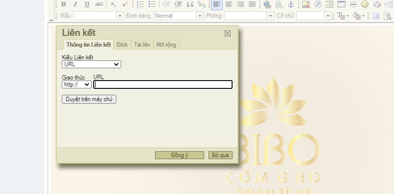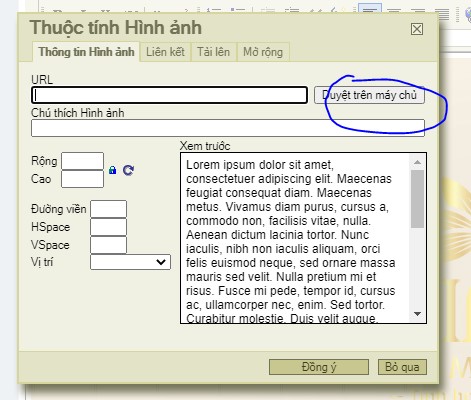 -> xuất hiện hộp thoại -> duyệt lên máy chủ -> chọn thư mục cần tải hình vào -> choose file ( chọn tệp ) -> upload -> chọn lại hình đã được upload lên -> ĐỒNG Ý